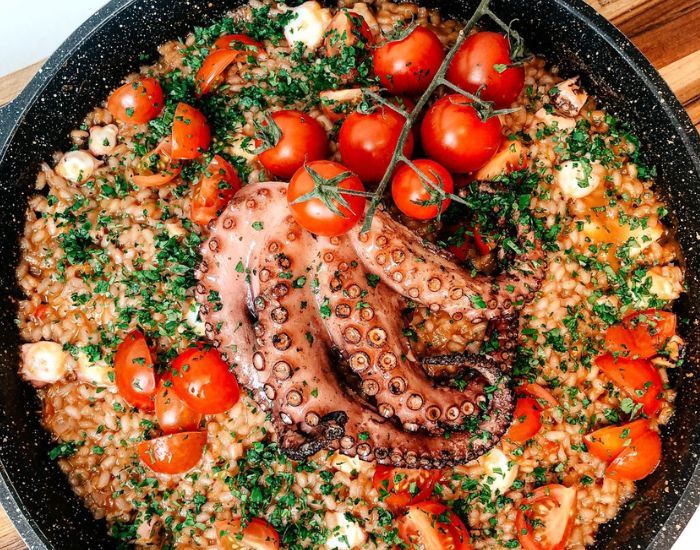 5 - Quando estiver cozido, adicione limão a gosto, salsinha picada, alguns cortes de tentáculos do polvo e tomate cereja picado.